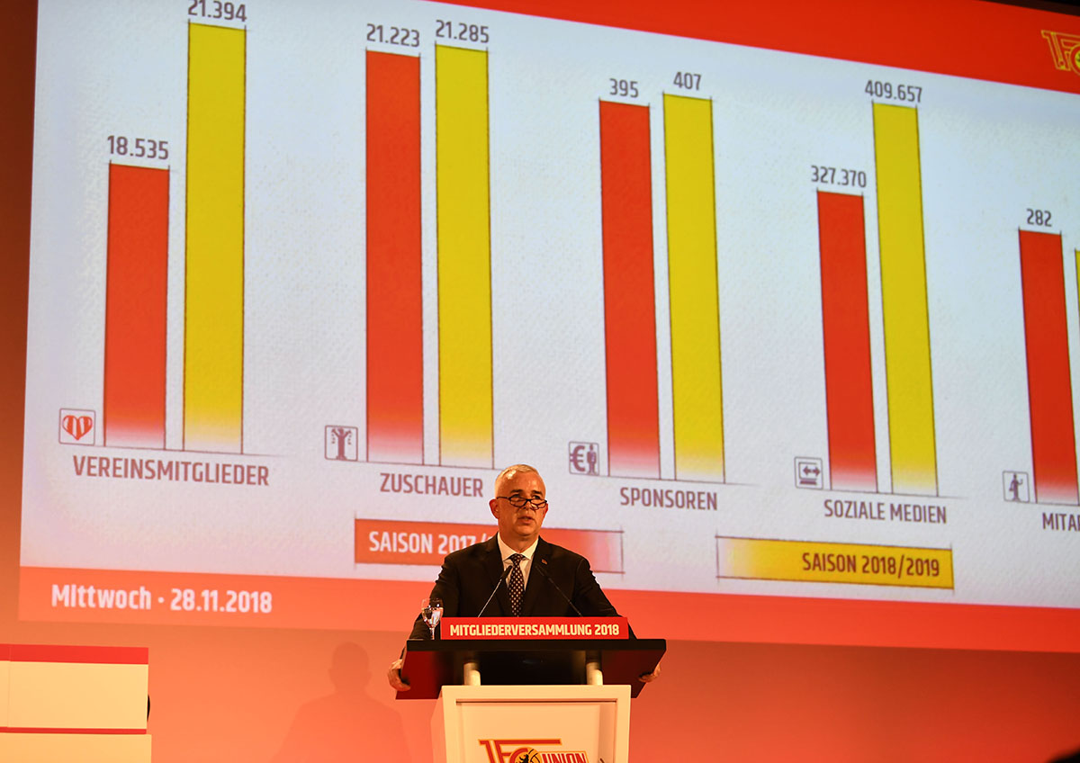 Die Mitgliederversammlung gestern in der Ballspielhalle Hämmerlingstraße sollte vor allem Ruhe und Konstanz vermitteln. Die Zahlen, die Union liefert, sind absolut beeindruckend (Einnahmen für die abgelaufene Saison bei 43,978 Millionen Euro und Ausgaben bei 43,783 Millionen Euro). Für die laufende Spielzeit wird mit Einnahmen von 47,076 Millionen Euro bei ähnlich hohen Ausgaben (47,006 Millionen Euro) geplant. Aber jenseits dieser Zahlen gilt bei unveränderter Zielstellung eigentlich das Gleiche wie in den vergangenen Jahren, nur wird es nicht mehr so deutlich formuliert. Mein Eindruck ist, dass es auch gar nicht um die ewige Frage geht, ob sportliche Ziele öffentlich formuliert werden oder nicht. Es geht vielmehr darum, die Mitglieder (fast 3000 mehr. Nun insgesamt 21.395 und damit erstmals mehr, als in den Heimbereich des Stadions passen) mitzunehmen auf diese Reise durch ein sich wahnsinnig schnell veränderndes Profifußballumfeld.