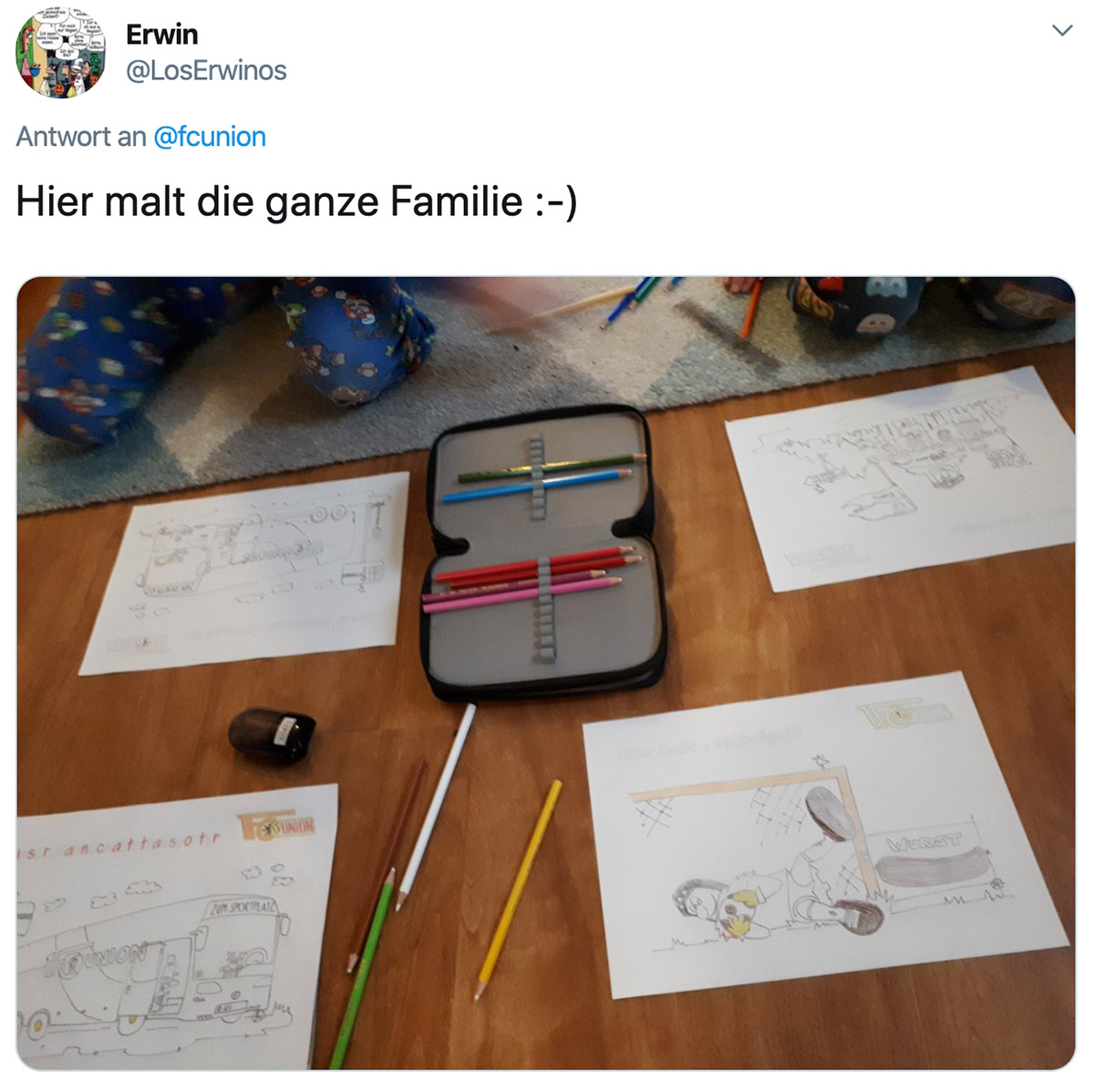 Union hatte am Mittwoch unter anderem Ausmalbilder von Matti Michalke als PDF zur Verfügung gestellt. Und wir können schon die ersten Ergebnisse begutachten: