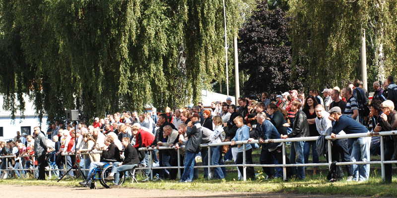 Auf den mit Gras überwachsenen fünf Stufen der Gegengeraden fanden neben den 271 zahlenden Zuschauern auch manche Pilze ihren Platz zum Punktspiel gegen die TSG Neustrelitz. Davor ein Wagen mit Getränken und Wurst. Das Bild vom Sonntagsausflug machten Familien mit Kinderwagen und eine Oma im Klappstuhl perfekt.