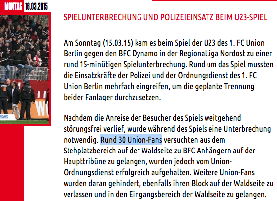 Interessant ist, dass bis auf den Tagesspiegel und den Kurier alle anderen Berliner Medien ungeprüft die Angaben der Polizei übernehmen, nach der 300 Unionfans die Haupttribüne gestürmt hätten (BZ/Bild, Morgenpost, Berliner Zeitung). Hier zeigt sich eine Schwierigkeit in der Polizei-Berichterstattung, in der die Kontakte zu Beamten, die Information weitergeben (wie gestern der unveröffentlichte Polizeibericht an die Polizeireporter der Berliner Zeitung und der Bild/BZ), vielleicht wichtiger sind als das Zwei-Quellen-Prinzip im Journalismus, nach der für eine Behauptung mindestens zwei voneinander unabhängige Quellen aufzutun sind. Wenn die sich widersprechen, muss man es so machen wie der Tagesspiegel: