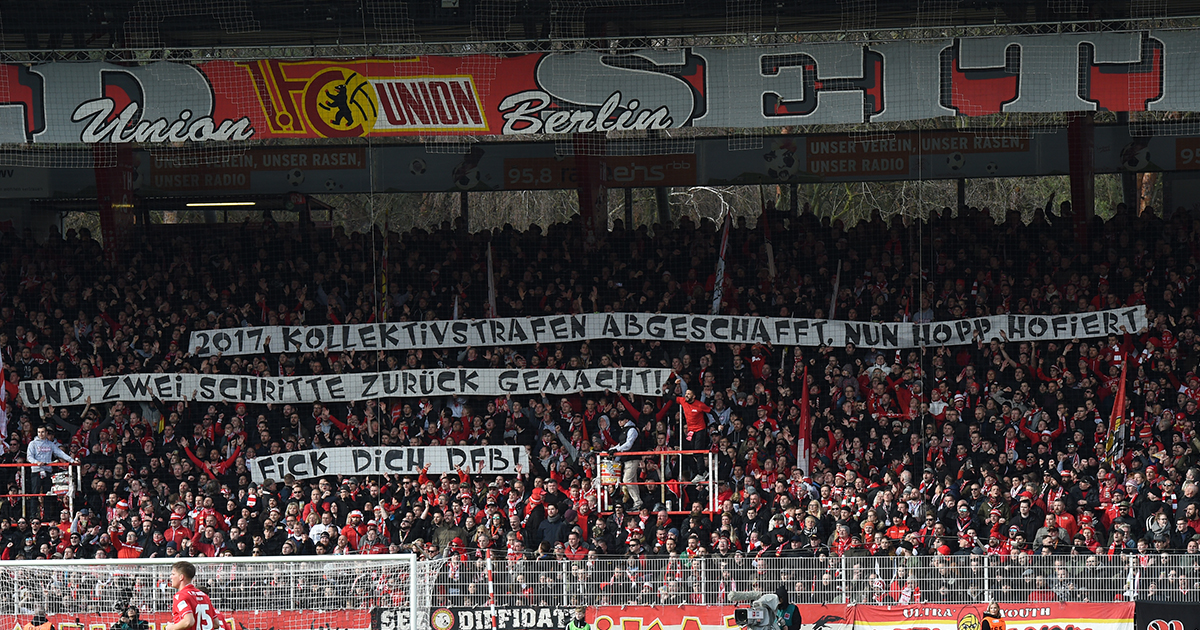 Eigentlich hätte ich hier heute gerne vor allem über Standard-Flanken von Christopher Trimmel geschrieben, die beim Spiel des 1. FC Union gestern gegen Wolfsburg das waren, was sportlich am besten funktioniert hat und zu beiden Toren beim 2-2 geführt haben. Aber der Sport war nicht, was von diesem Spiel hängen bleiben wird. Das sind vielmehr die Proteste gegen Kollektivstrafen des DFB und dessen Reaktion darauf – und was das für den sozialen Raum Stadion einerseits und den Zusammenhalt bei Union andererseits bedeutet.