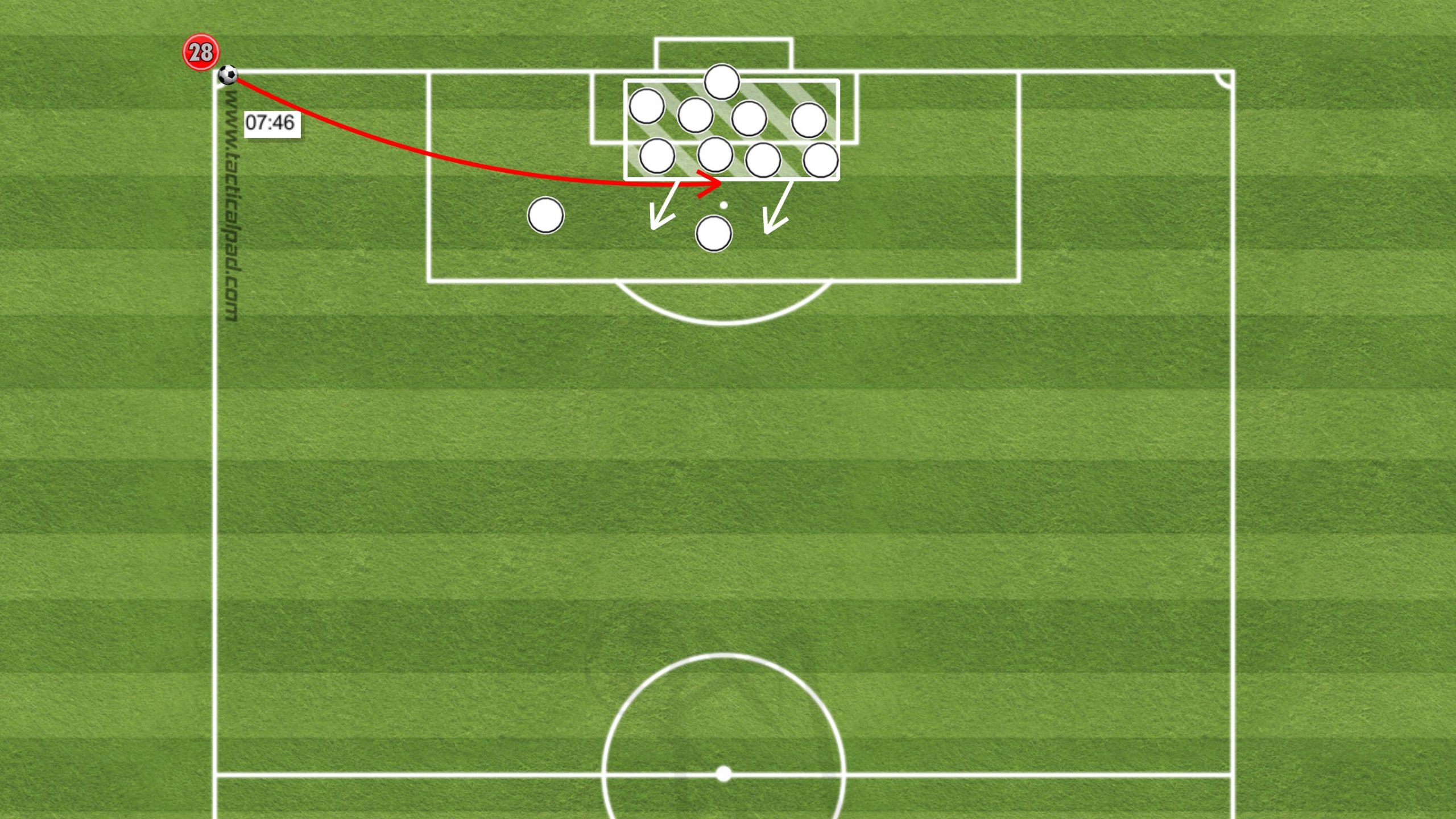Alternativen: Becker hat die Möglichkeit sich in Antons Rücken zu lösen um dort mit einem kurzen Steckpass in Abschlussposition zu kommen. Es wäre für Becker auch möglich sich in den Rücken Mavropanos zu lösen um mit einem Chipball zum zweiten Pfosten anspielbar zu werden.