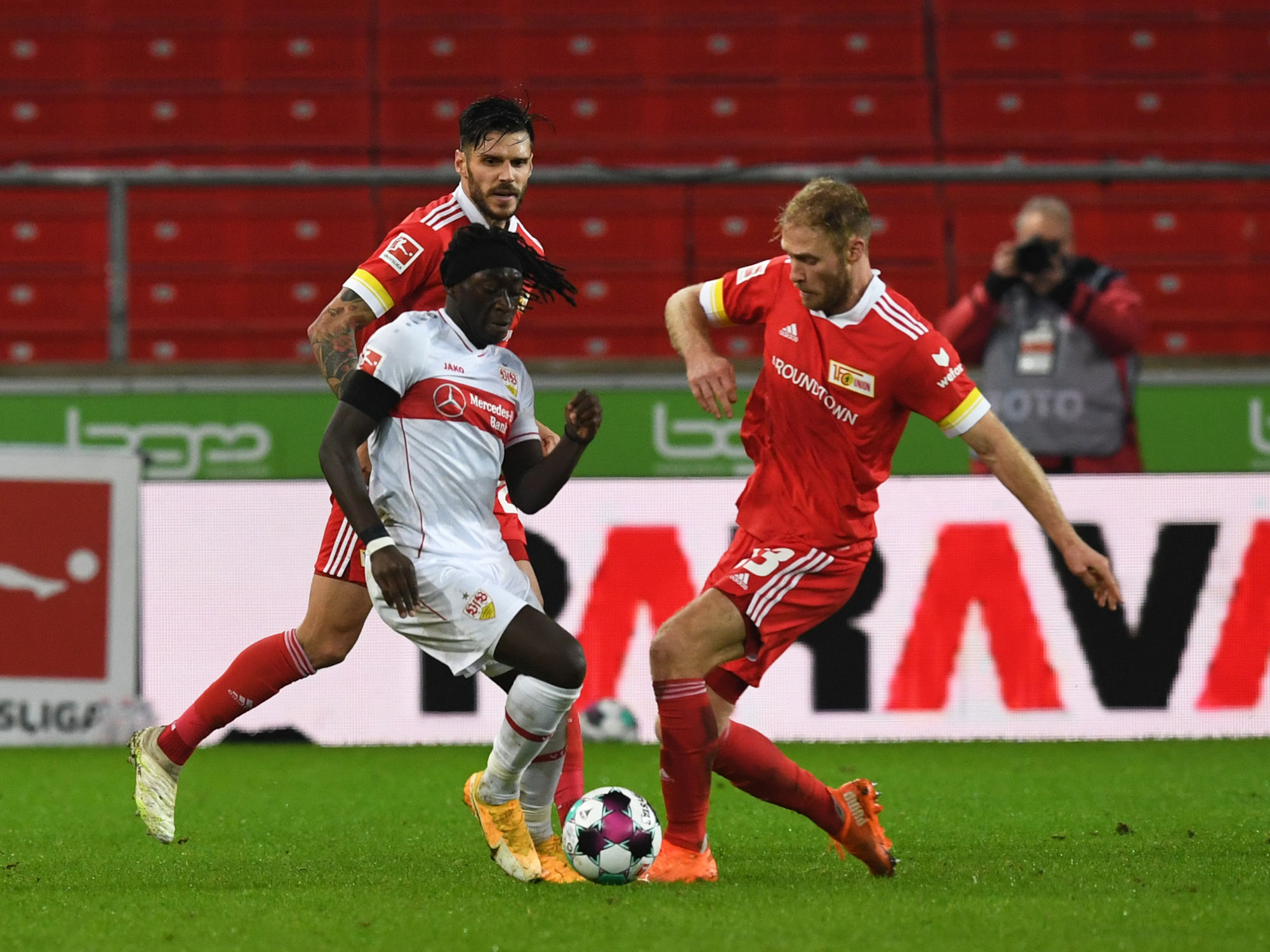 Endo, der als Verbindungsspieler und hoher Anspielpunkt in einer Raute mit der Dreierkette fungierte, wurde in der Regel erst zwischen beiden Stürmern Unions aufgenommen. Sobald er höher schob, suchte Prömel Kontakt zu ihm, um ihn im Moment des Passes zu pressen. Im zentralen Mittelfeld hielt Griesbeck Kontakt zu Castro, Teuchert in der Regel zu Förster. Förster ließ sich dabei häufig auf den Flügel fallen, woraufhin sich Wamangituka nach Innen in den Halbraum bewegte oder sich Klimowicz hinter Teuchert zeigte. Da Teuchert seine Höhe geschickt anpasste und mit Hilfe seines Deckungsschattens den tiefen Passweg durch den Halbraum kontrollierte, Lenz und Gießelmann dahinter konzentriert die Übergaben organisierten, die Bewegungen der Stuttgarter aber auch eine sehr geringe Dynamik hatten, liefen die Angriffsversuche des VfB aber oft ins Leere.
